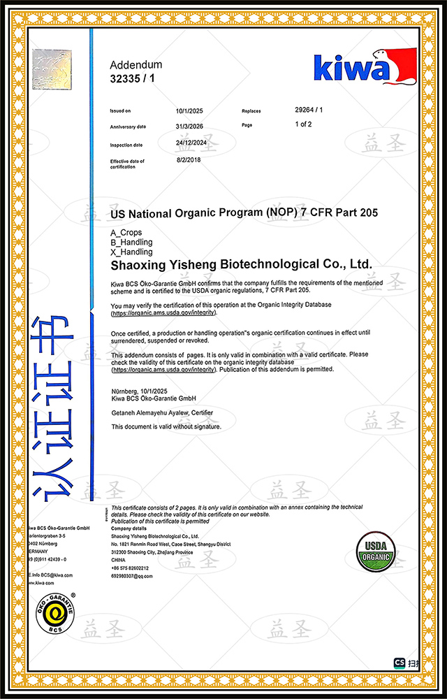 萬事達麥業(yè)旗下益圣生物榮獲日本JAS及美國USDA有機證書